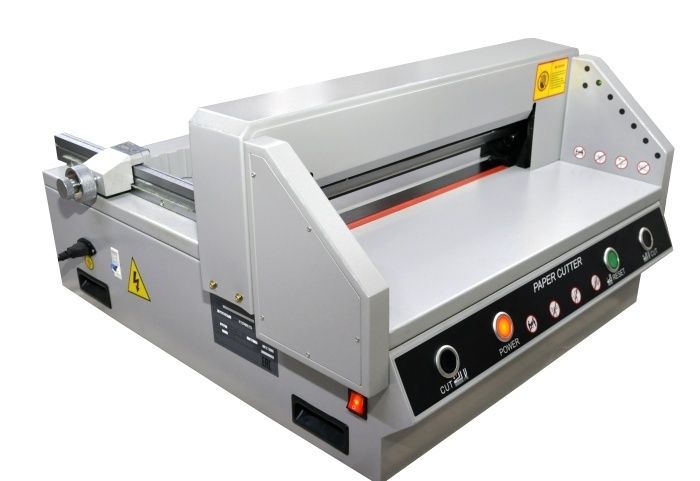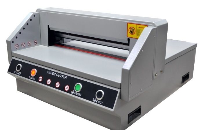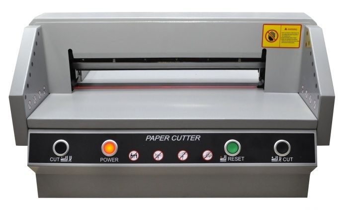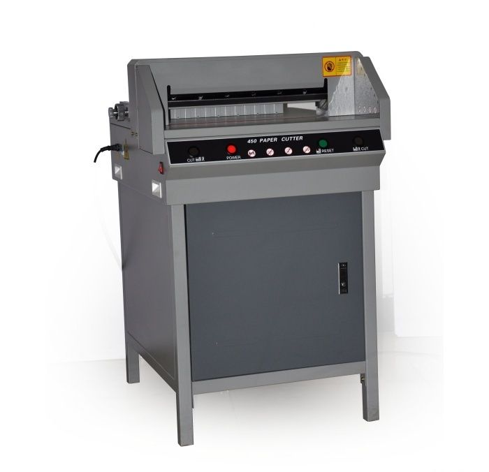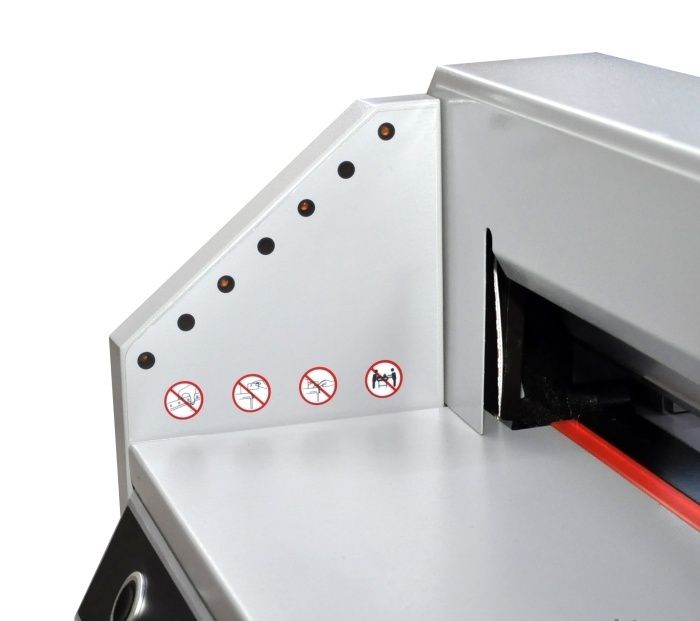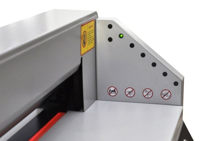 FRONT G450V+ - Очень удачная модель недорогой гильотины с механическим приводом лезвия (электромотор + редуктор) для использования как вспомогательной, для подрезки уже готовой продукции. Модель имеет все необходимые современные системы блокировки для защиты рук оператора. Электроники минимум, увеличена толщина металла у ответственных деталей.