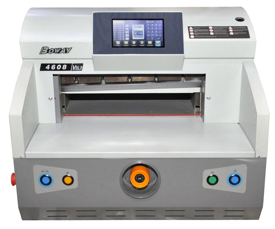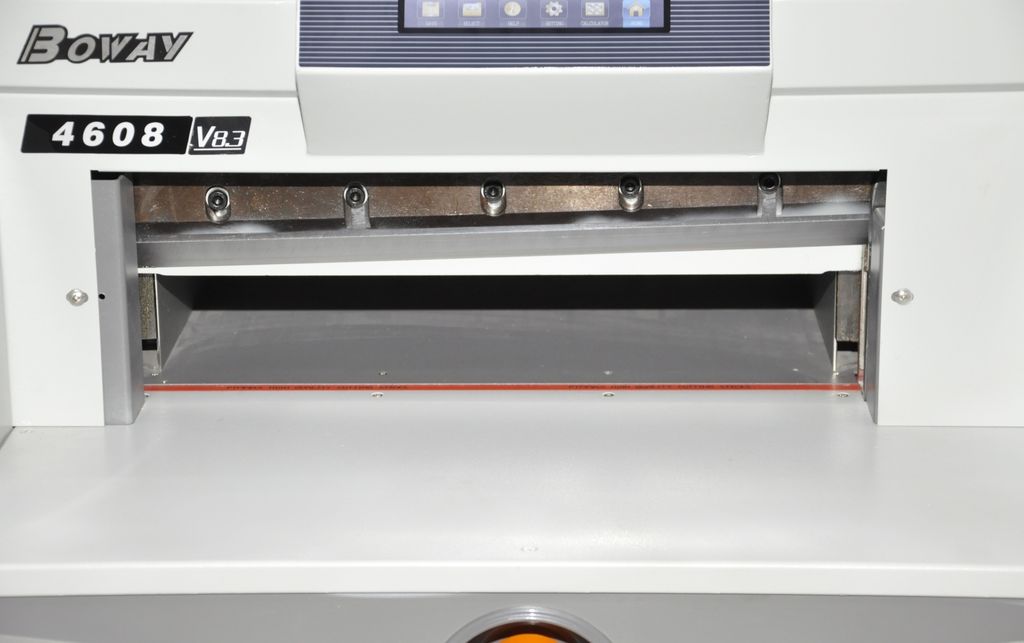 BW-4608 – новая линейка гильотин Boway, с механическим приводом лезвия (электромотор + редуктор) и полноцветным сенсорным LCD для удобства настройки и программирования. Прижим бумаги с электроприводом и регулировкой усилия. Возможность автоматической выдачи бумаги после реза. Полностью переработан привод затла: теперь затл двигается по двум направляющим, которые находятся по краям, а стол не имеет прорези посередине. BW-4608 может использоваться как основная в небольших типографиях, или как вспомогательная для подрезки уже готовой продукции. Модель имеет все необходимые современные системы блокировки для защиты рук оператора. BW-4608 отличается от BW-4606 высотой стопы бумаги, которую она может порезать.