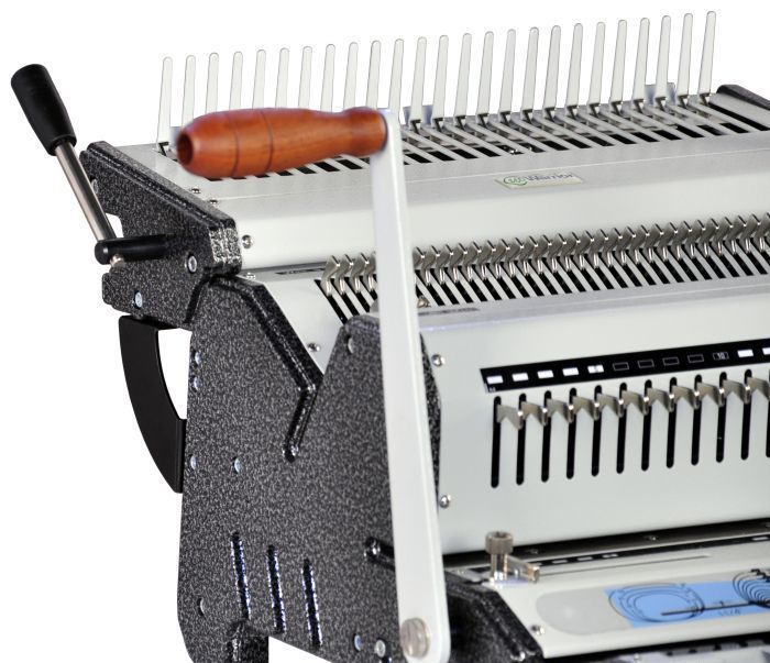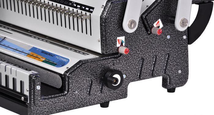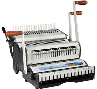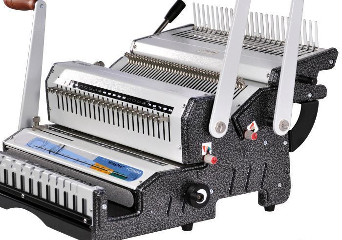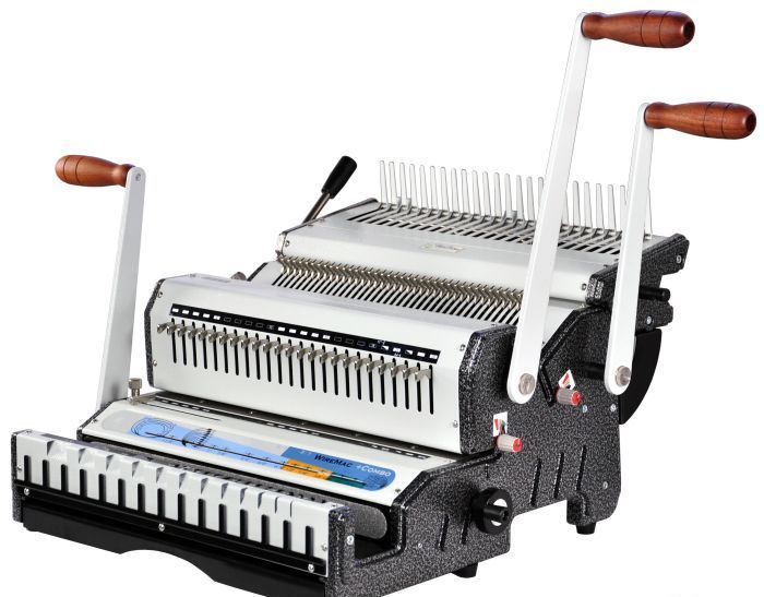 Универсальная переплетная машина WireMac-Combo от тайваньского бренда Warrior. Переплетает на пластиковую пружину до 500 (80г/м²) листов диаметром от 6мм до 51 мм и на металлическую пружину до 120 (80г/м²) листов шагом 3:1, диаметром пружины от 4,8 мм до 14,3 мм. Мощность дырокола до 20 листов. Брошюратор WireMac-Combo оснащен удобными рукоятками для перфорации под металлическую и пластиковую пружину. Функция отключения ножей дает возможность сделать перфорацию в любом месте по краю бумаги. Модель оснащена отдельными (для каждого вида пружин) ручками для перфорации отверстий в бумаге и отдельными ручками для сжатия металлической пружины и разжатия пластиковой. WireMac-Combo имеет современный дизайн, пробивает прямоугольные отверстия, имеет специальный определитель диаметра пружины. Механизм зажима у данной модели оснащен полосками с фрикционным напылением для предотвращения поворота пружины во время зажатия. Для организаций и типографий со средним и большим объемом работ.