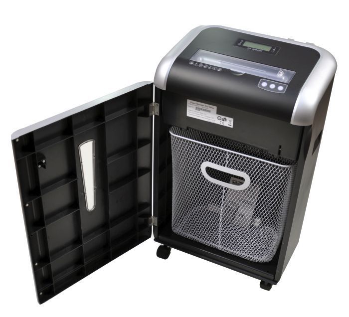 Модель уничтожает степлерные скобы, диски CD/DVD и кредитные карты, есть отдельное отверстие для уничтожения кредитных карт и дисков, закрывающейся шторкой.